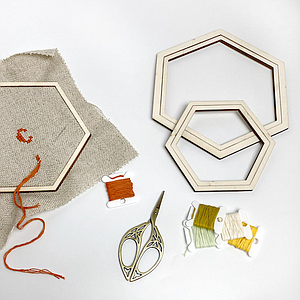 Conjunto de 3 bastidores hexagonales para bordado. Los tres están formados por 2 hexágonos concéntricos que encajan perfectamente y que dejan la tela tensa para bordar cómodamente